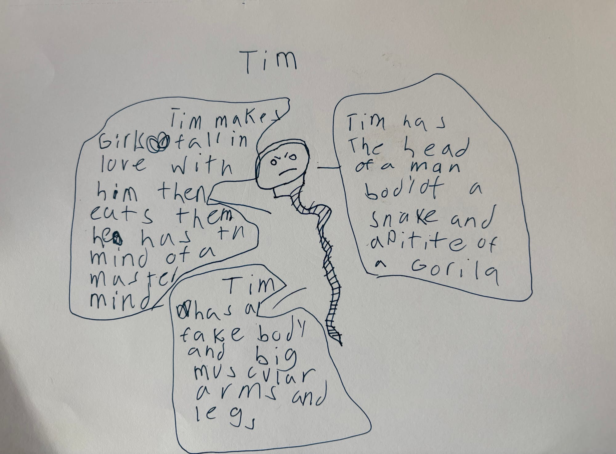 Tim has a fake body and big muscular arms and legs. Tim has the head of a man, body of a snake and appetite of a gorilla.
