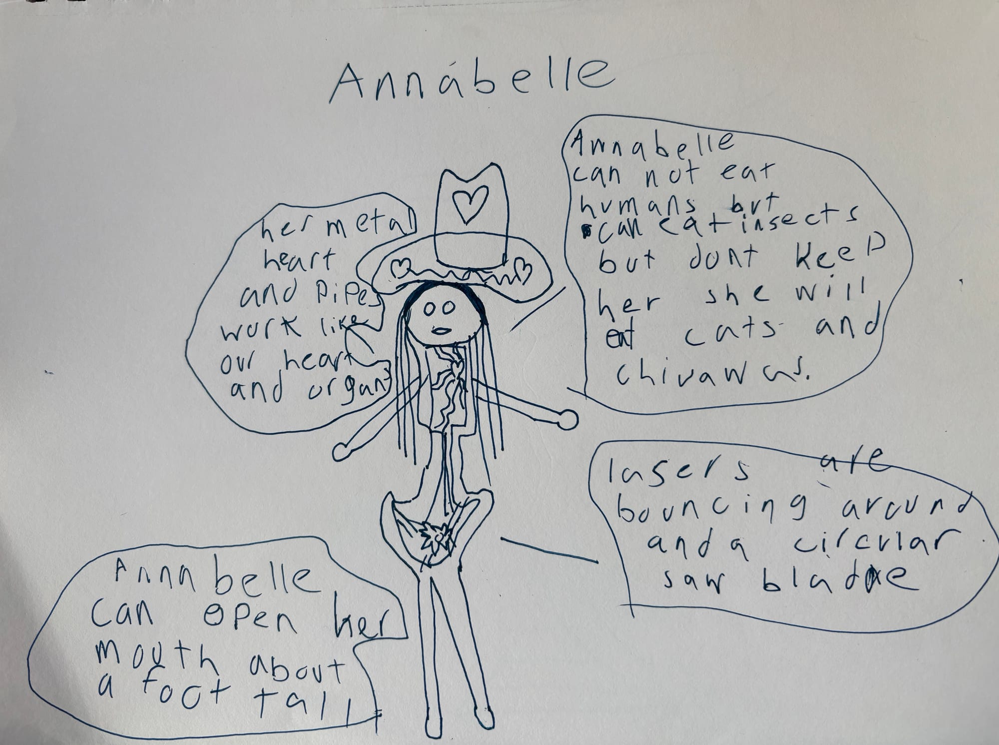 Her metal heart and pipes work like our heart and organs. Lasers are bouncing around and a circular saw blade. Annabelle can open her mouth about a foot tall.