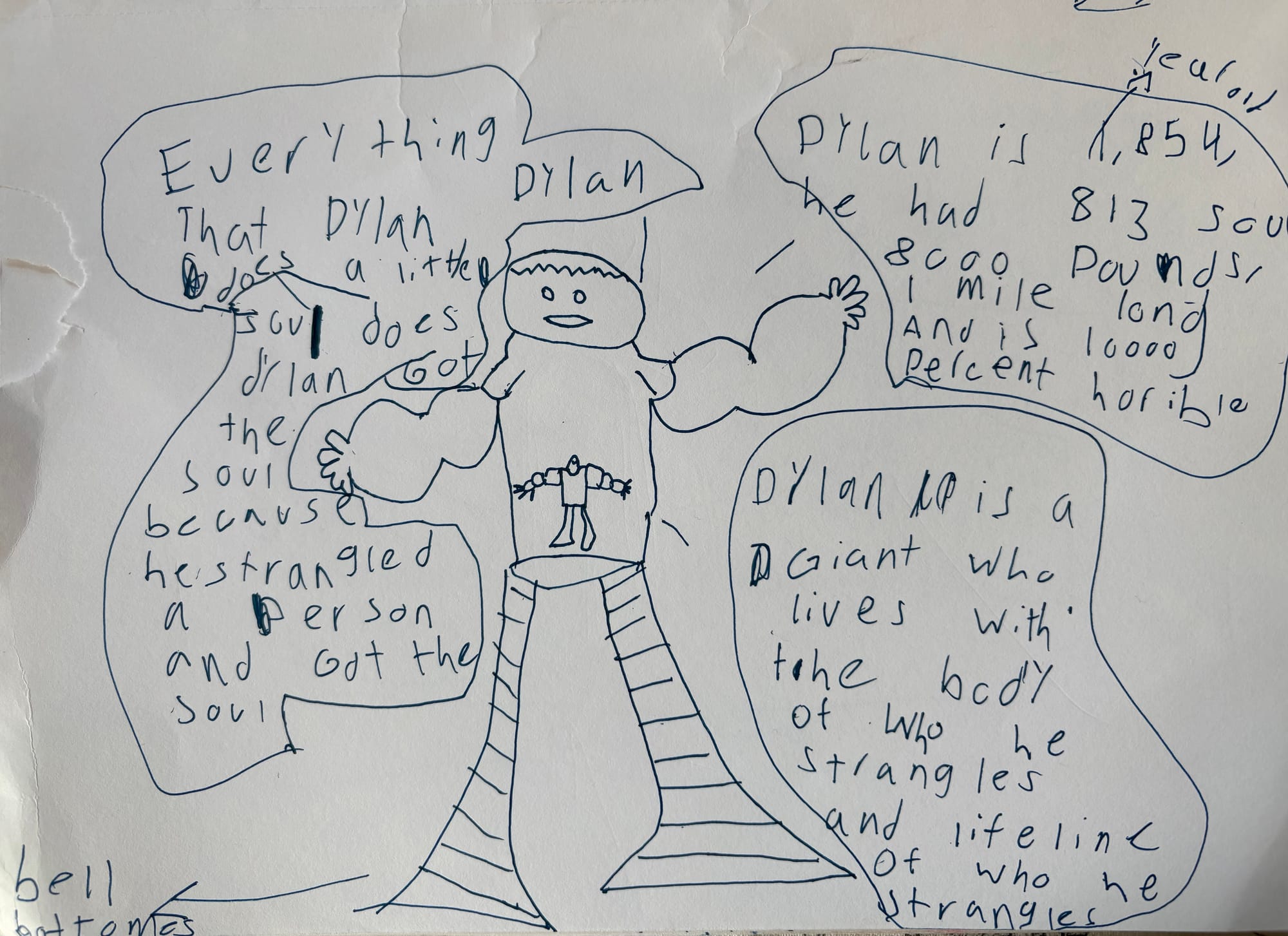 Dylan is 1,854 years old, 8,000 pounds, 1 mile long, and is 10,000 percent horrible. Dylan is a giant who lives with the body of who he strangles and lifeline of who he strangles.