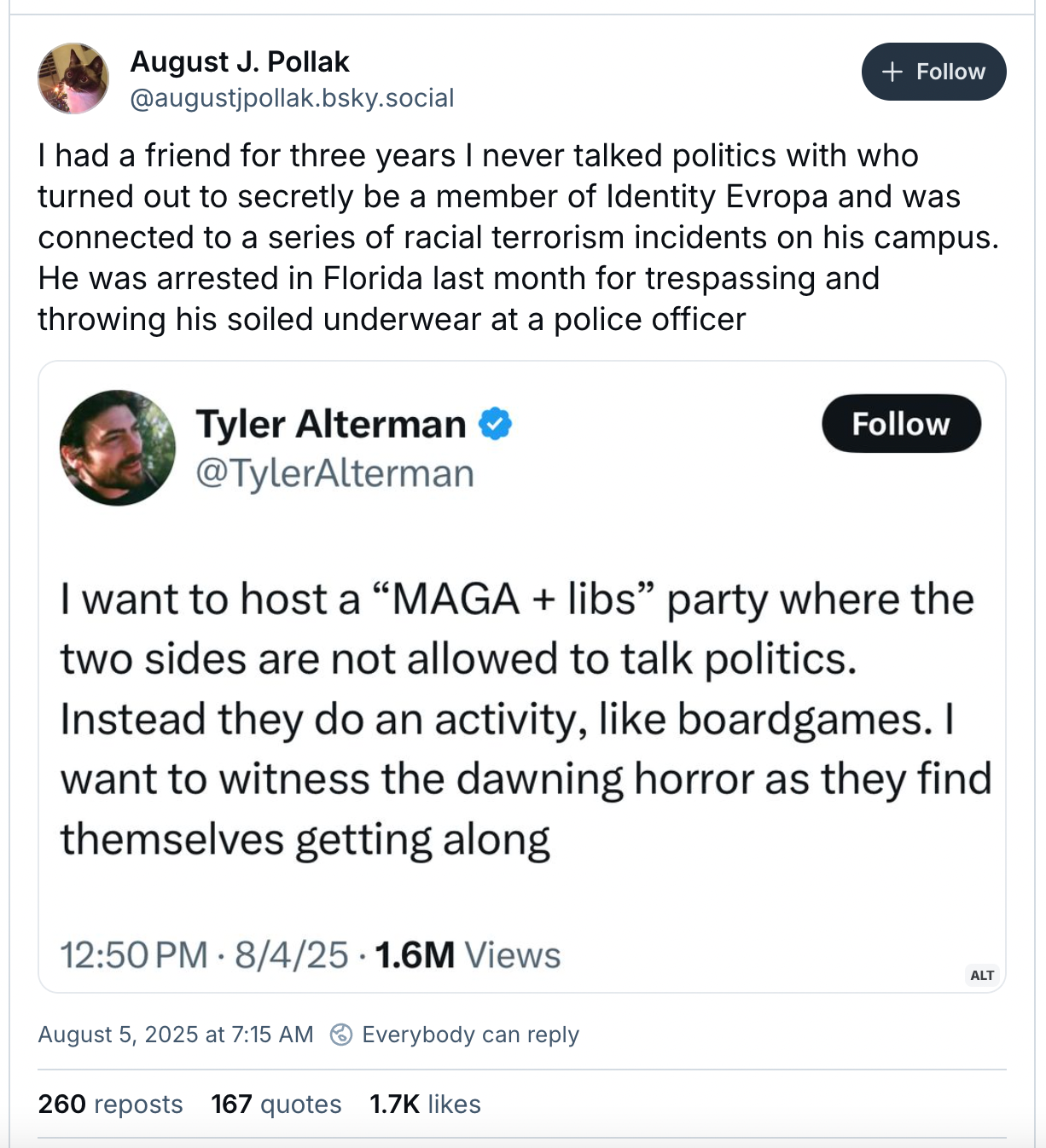 But I was worried about getting out of that theater in one piece, and I don’t think I was wrong. I think that if you’d been in that position, you too would suddenly find it immensely important to know which jokes those old white people were actually laughing at and why. If Eddington has a claim to being Great Art, it’s because of how it crystallized that truth: I am terrified of my fellow Americans. I might try to push that feeling down, or disguise it as something safer, like anger or mean jokes about their cars, but the fact is that I do not feel safe. Everyone is losing their minds right now, half of these people are goddamned maniacs, God knows how many of them are armed already, and there is certain, quickly growing class of maniac whose delusions revolve entirely around trans people being a cosmic threat.