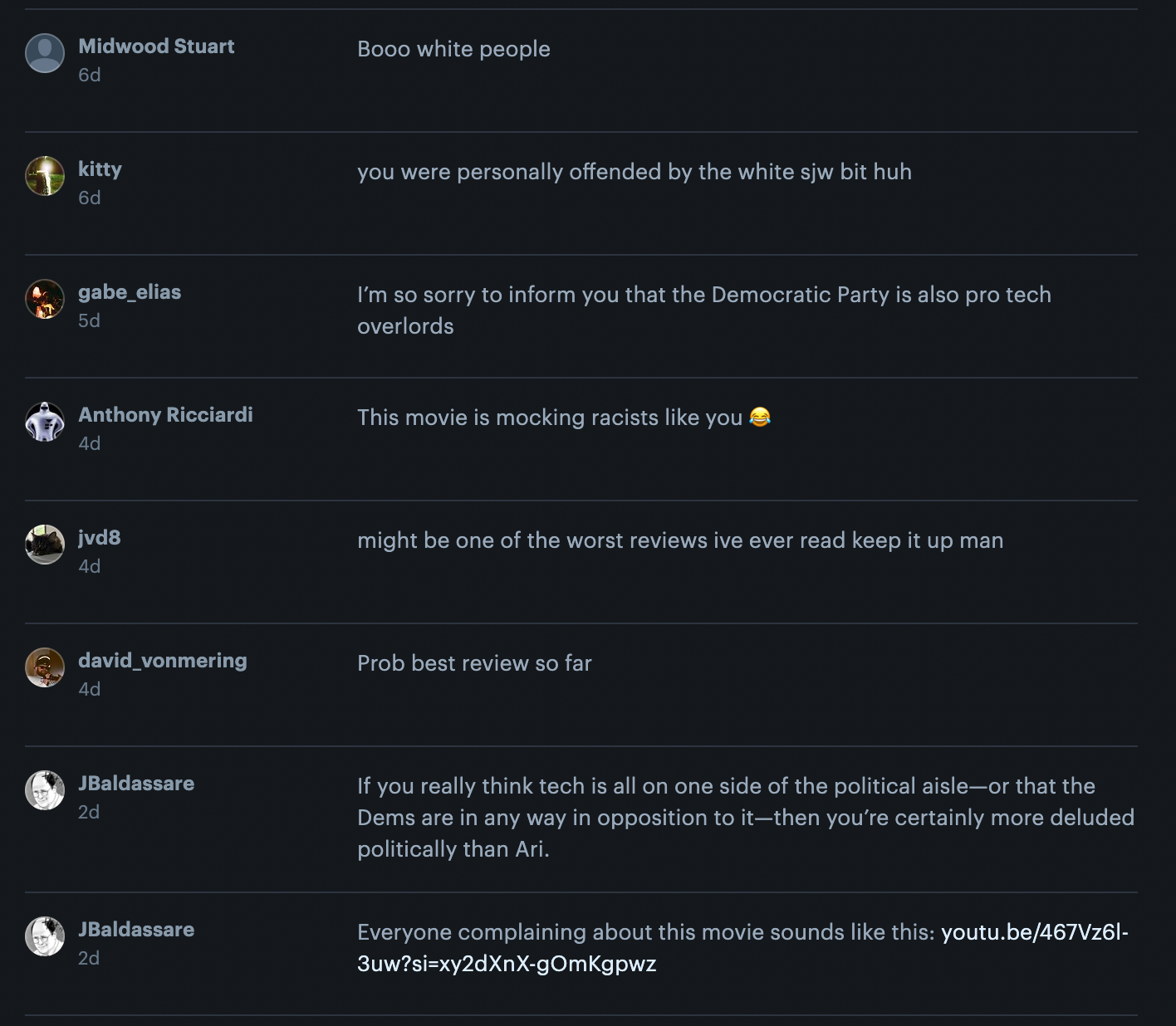 Who’s really condescending to small-town rural white folks here? Me, the small-town rural white guy who’s concerned about potential messaging misfires in Eddington? Or the guy who made a whole movie about how no-one takes Joe seriously, but didn’t realize that Joe also goes to the movies, and that he would show up?