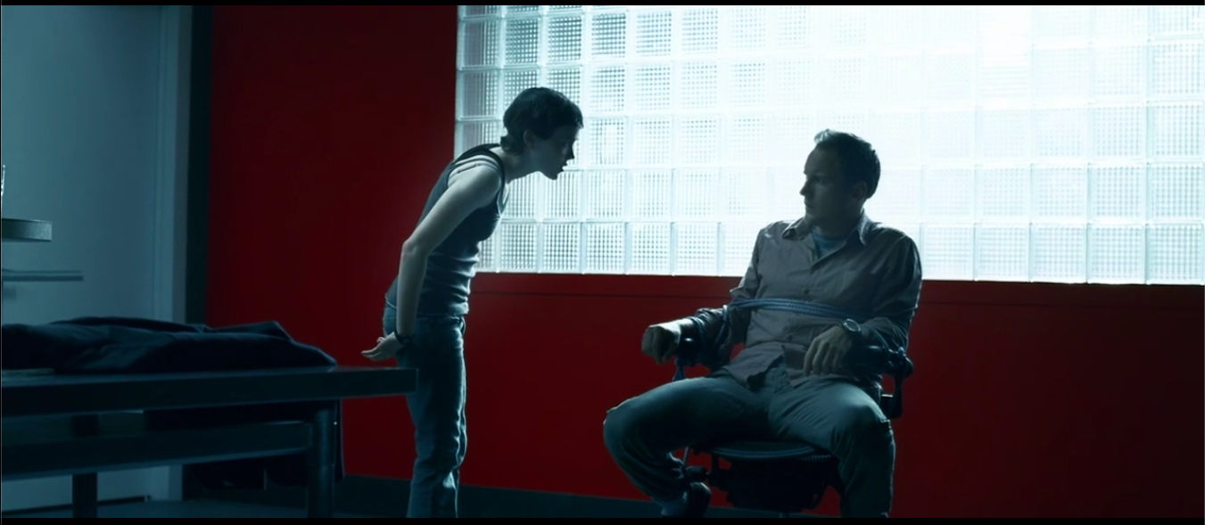 Back at the creep’s apartment, Page starts mixing screwdrivers and taking his shirt off, and we brace for the worst. We don’t get it, but Patrick Wilson does. He passes out before he can try anything, and when he wakes up, he’s strapped to a chair, with Elliot Page looming over him and threatening to pour bleach into his mouth if he screams. This new boy has questions about the missing girl, and he is not cute or bubbly at all.
