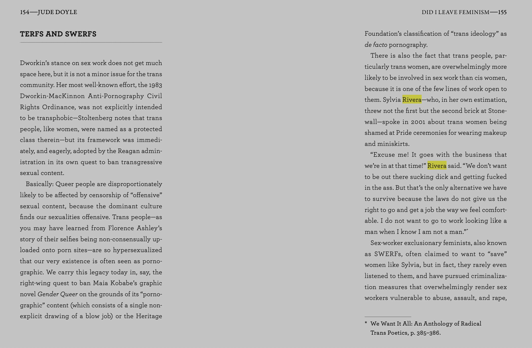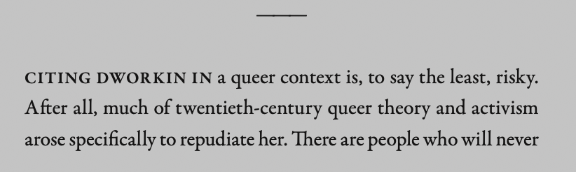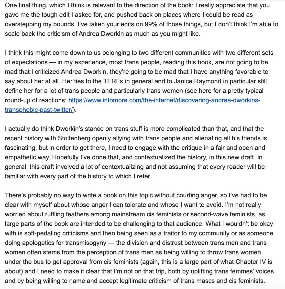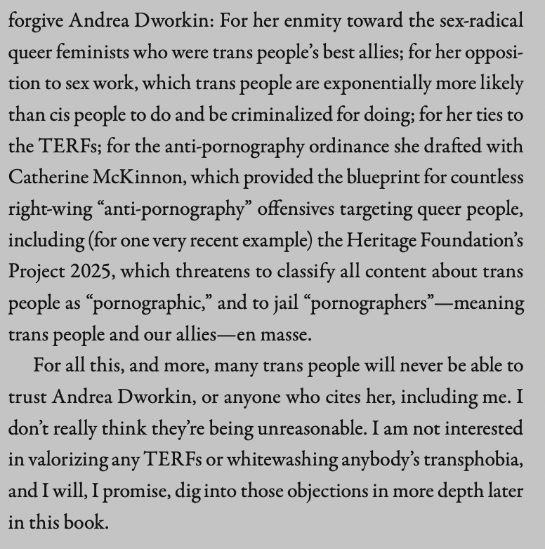 This is not some far-away, theoretical debate. One of the people who was angriest about all this had, in fact, read DILF. In fact, they were in it. I'm not naming them or using an identifying pronoun – I will if they ask me to, but more than one trans person familiar with the situation worried that it would place a target on their back. As far as I can figure, they felt blindsided by my citation of Dworkin and interview with Stoltenberg. They argued that, by “platforming” their work, I was paving the way for TERFs and SWERFs to infiltrate the community — once people started reading Dworkin, the process of radicalization would be inevitable – and that by interviewing them, I'd inadvertently enlisted them in whitewashing figures they despised.
