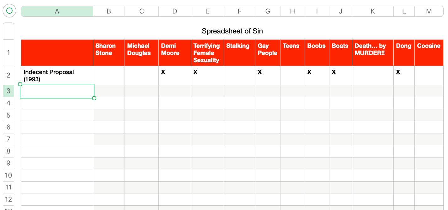 As you can see from the spreadsheet, the erotic thriller is a tight, contained, formally rigorous genre. There are a few regular actors and a few regular directors; there are a few standard plots; the second-tier movies in this genre tend to just be unofficial remakes of the A-list ones. An erotic thriller hits a few expected beats, in order, every time, and you hope it hits them well enough to satisfy you. It’s a lot like marriage that way.