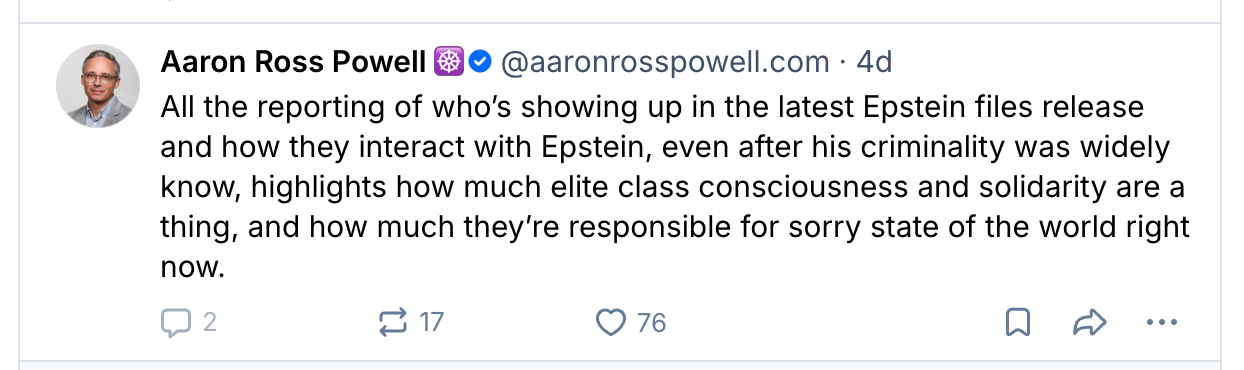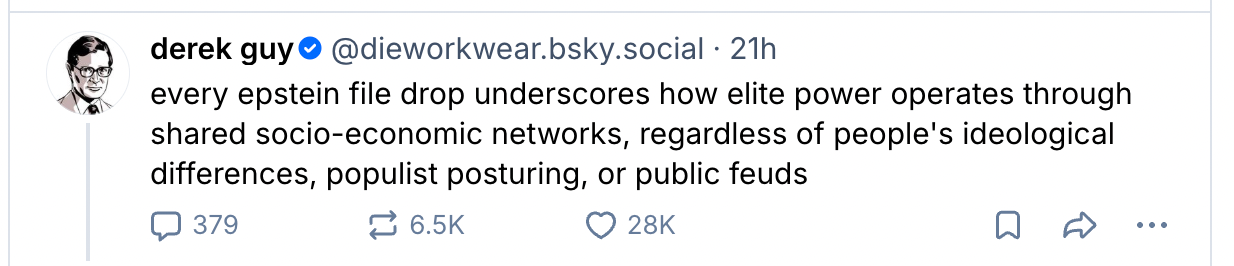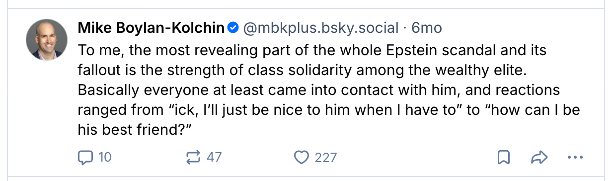 Epstein’s extreme wealth, and that of his clients, absolutely does matter: It gave him reach, and resources, and connections, and more than the usual level of impunity. Most notably, it gave him influence, and allowed him to engineer the far-right global resurgence from behind the scenes — a project he participated in with many other rich people who shared his interests. That’s a very important angle to this story that I will absolutely not be covering today.